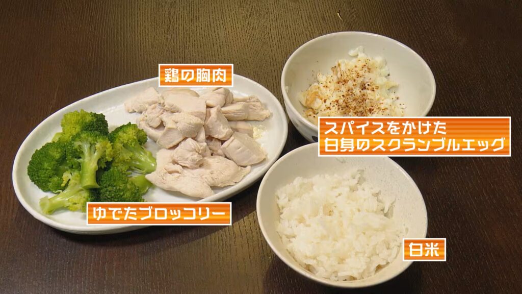 - 鶏むね肉・白米・野菜中心
